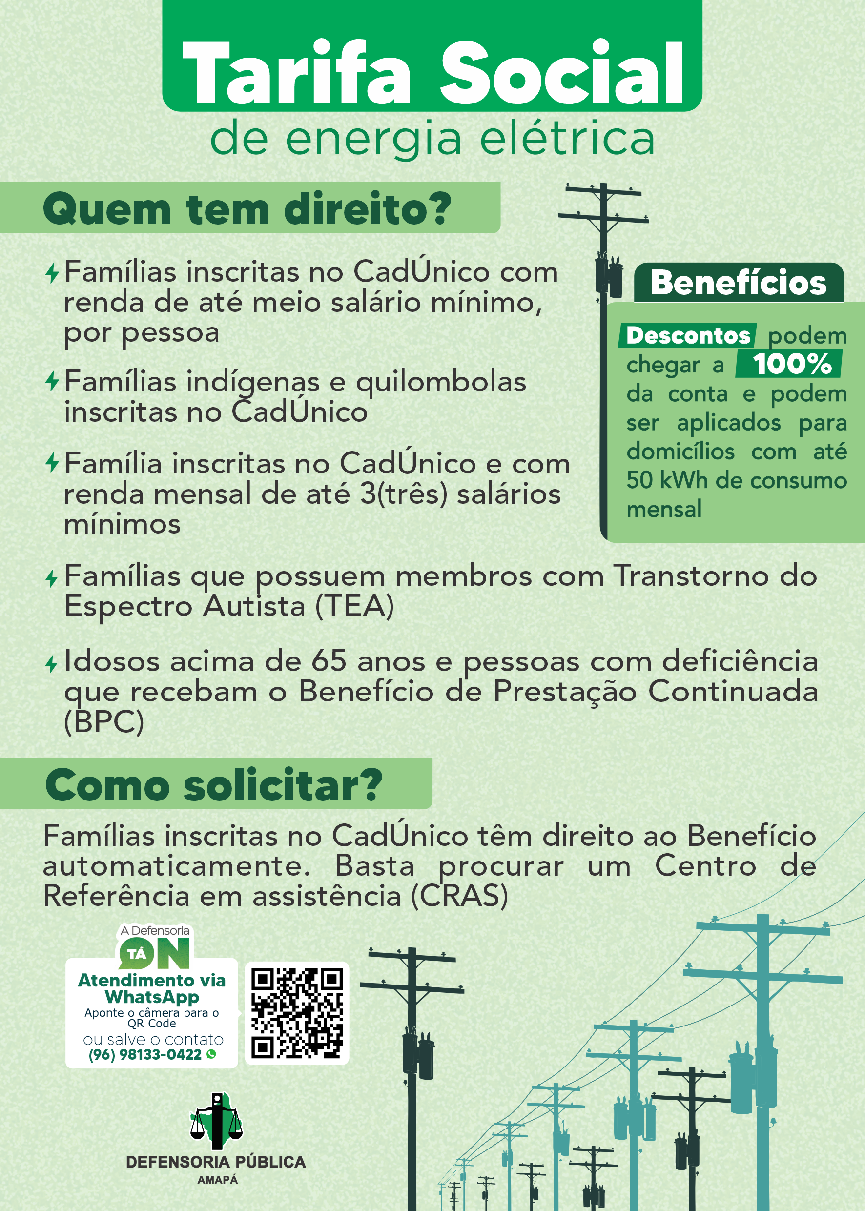Saiba quem tem direito e como solicitar os descontos na conta de energia elétrica, ofertados pela Tarifa Social de Energia Elétrica...Download PDF Ler mais...